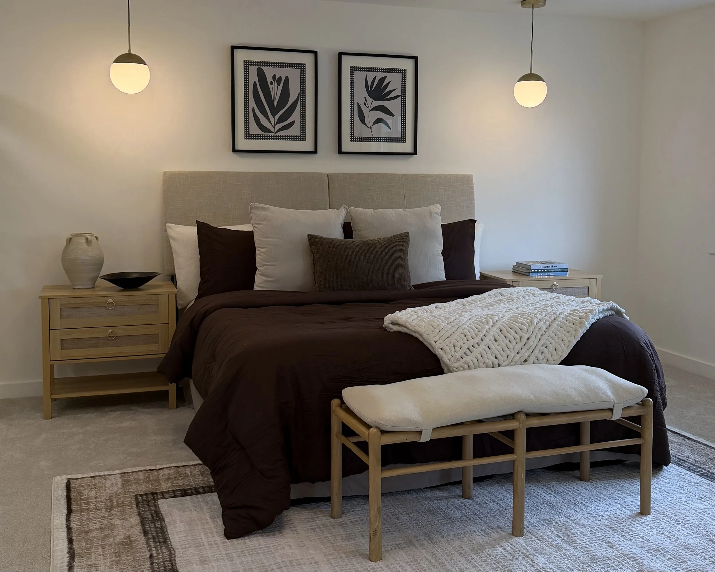 Accessory styling (artwork, pillows, rugs, greenery)
